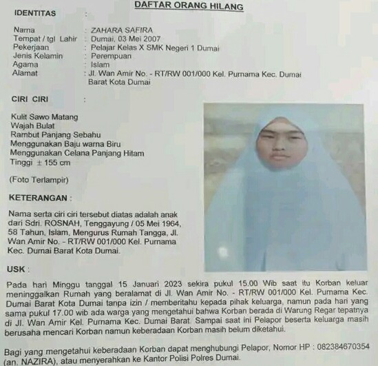 DUMAI, detak24.com - Seorang siswa kelas X SMKN 1 Dumai dilaporkan hilang sejak Ahad (15/01/23). Korban bernama Zahara Safira, terakhir...