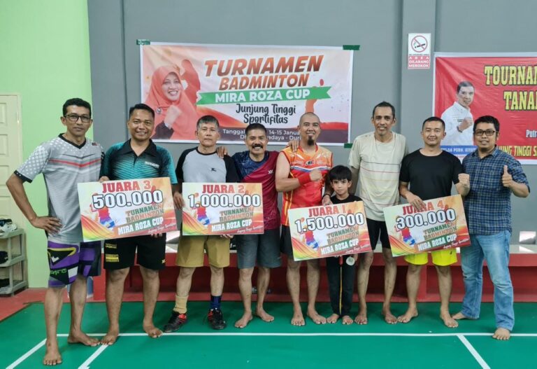 DURI, detak24.com – Final Turnamen Badminton Mira Roza Cup yang berlangsung Ahad (08/01/23) di Hall Putra Ridho dimenangkan pasangan Dedet-Eka...