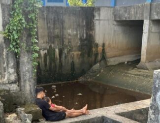 Pria memeluk anak kecil duduk di pinggir parit Jalan Pesisir, Rumbai. f : ist