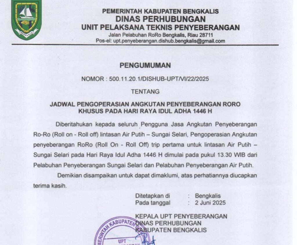 “Untuk trip penyeberangan Roro Bengkalis-Pakning pada Jumat, tanggal 06 Juni 2025 dimulai pukul 13.30 WIB,” ujarnya dalam surat edaran yang disebarkan di medsos.