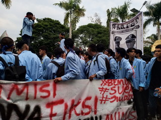PEKANBARU, detak24com - Aksi ratusan mahasiswa Universitas Riau (Unri) di kawasan parkir Kantor Gubernur Riau membentangkan baleho bergambar Gubernur dan...