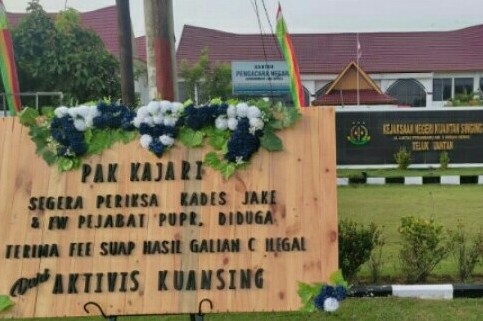 KUANSING, detak24com - Satu papan bunga bertuliskan "Pak Kajari segera periksa Kades Jake dan IW pejabat PUPR. Diduga terima fee...