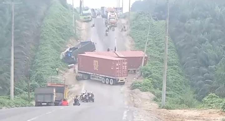 PELALAWAN, detak24com - Truk Fuso B 9055 UIZ dengan truk kontainer B 9039 SEH panjang sekitar 12 meter, terguling di...
