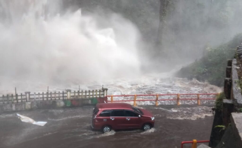 Air terjun Lembah Anai meluap membanjiri jalan lintas Bukittinggi-Padang. f : ist