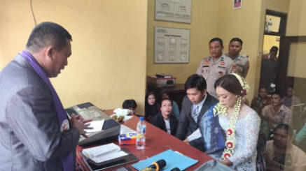 Tahanan tersebut diketahui bernama Gunawan, yang melangsungkan pernikahan dengan Desta Natalia melalui prosesi pemberkatan secara sederhana oleh pihak gereja di aula Mapolsek Sujud.